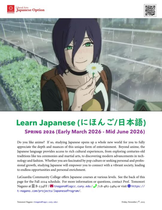 LaGuardia Community College offers Japanese courses at various levels in Spring 2026. For those who are interested in pursuing careers in Japan Studies, the college also offers Liberal Arts Option (major) in Japanese. For more information, contact Prof. Tomonori Nagano …